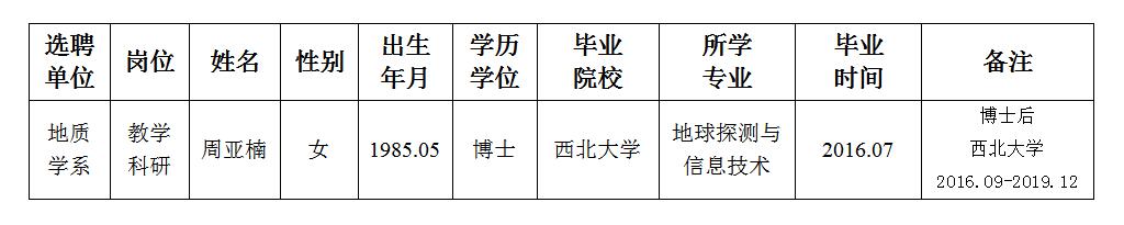经用人单位及教学督导考核、学校研究,拟同意选聘下列人员来校工作,其聘任关系为A类人事代理。本着公平、公正、公开的原则,现将拟选聘人员基本情况公示如下: