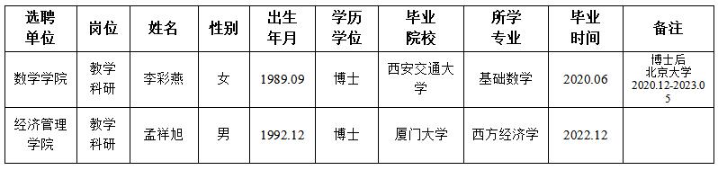 经用人单位及教学督导考核、学校研究,拟同意选聘下列人员来校工作,其聘任关系为A类人事代理。本着公平、公正、公开的原则,现将拟选聘人员基本情况公示如下: