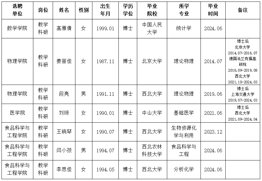 经用人单位推荐,人力资源部审查,学校教学督导及院系相关专家考核,星空app官网拟确定下列人员来校工作。本着公平、公正、公开的原则,现将本次拟选聘人员基本情况公示如下: