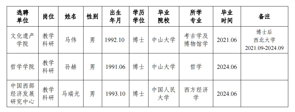 经用人单位推荐,人力资源部审查,学校教学督导及院系相关专家考核,学校专家评审会审议,星空app官网拟确定下列人员来校工作,聘任方式为事业编正常选聘。本着公平、公正、公开的原则,现将本次拟选聘人员基本情况公示如下: