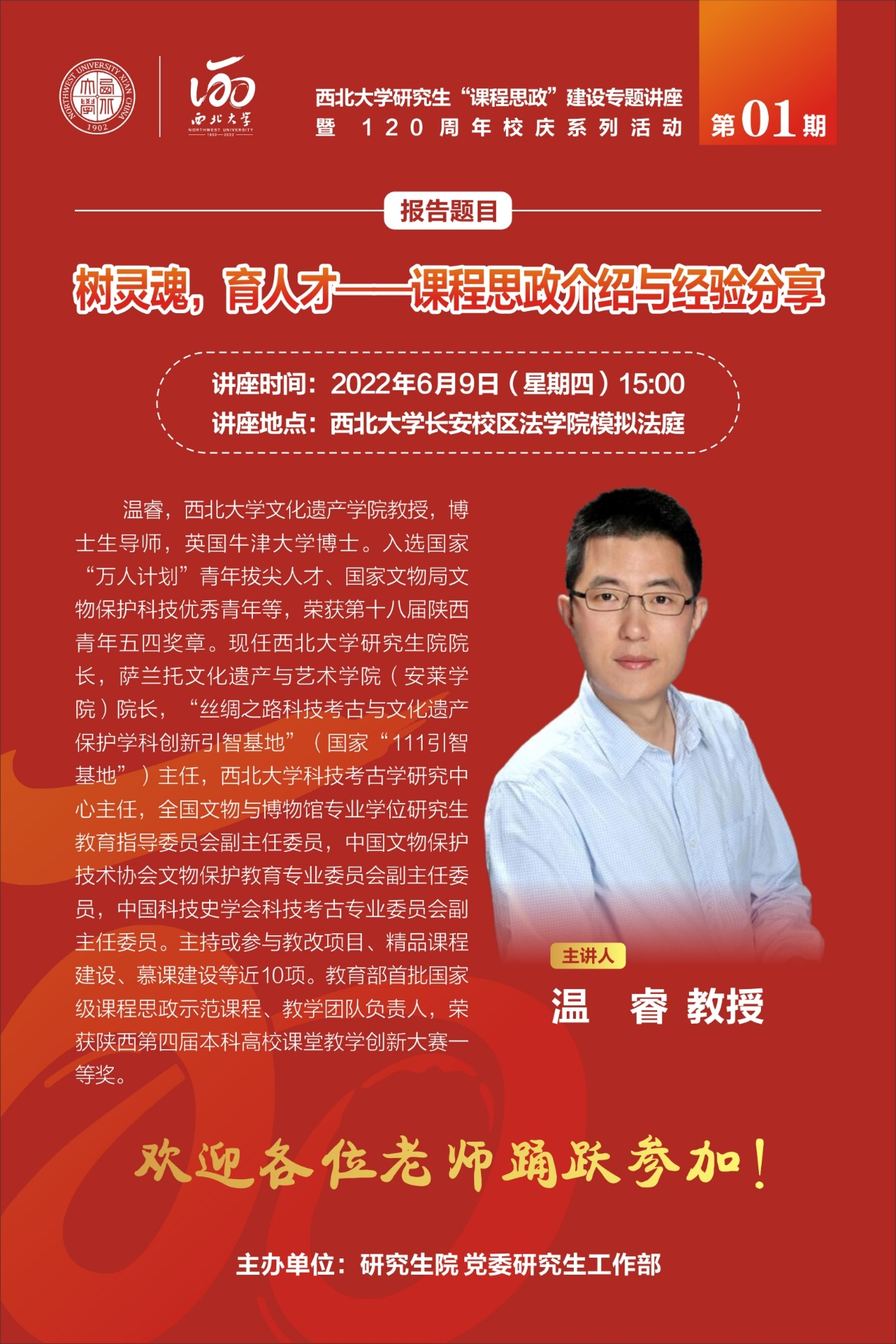 第1期,我们邀请到教育部首批国家级课程思政示范课程、教学团队负责人星空app官网文化遗产学院温睿教授进行“课程思政”专题培训,欢迎对课程思政建设感兴趣的各位老师积极参加,拟申报2022年校级、省级及国家级研究生课程思政示范课的课程负责人、团队成员踊跃参与!