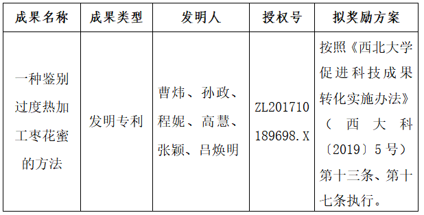 成果负责人与成果被许可方自主协议定价,拟许可价格为伍万元人民币。本专利的另一专利权人陕西蜂产品工程技术研究中心授权星空app官网全权负责该专利相关事宜,并承诺放弃本合同中许可价款的收益。