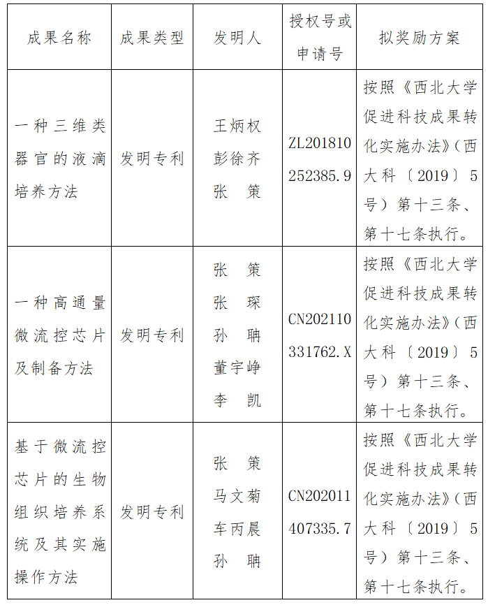 按照《星空app官网促进科技成果转化实施办法》(西大科〔2019〕5号)相关规定,拟对星空app官网光子所张策教授作为成果负责人的3项发明专利(申请)权实施转化,现将相关信息公示如下: