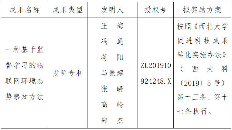 按照《星空app官网促进科技成果转化实施办法》(西大科〔2019〕5号)相关规定,拟对星空app官网信息科学与技术学院王海副教授作为成果负责人的1项发明专利权实施转化,现将相关信息公示如下: