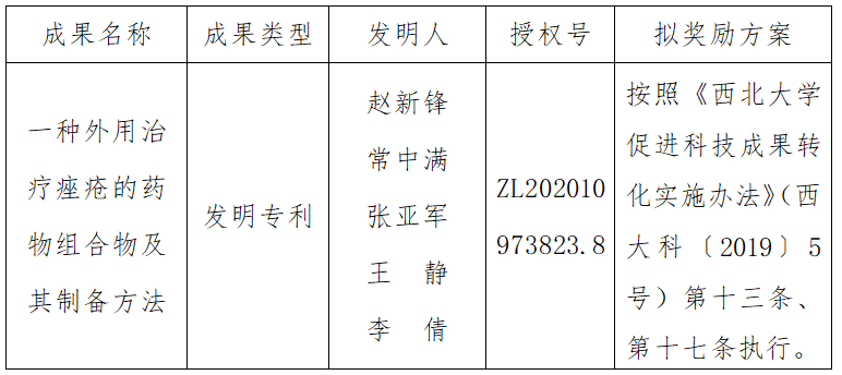 按照《星空app官网促进科技成果转化实施办法》(西大科〔2019〕5号)相关规定,拟对星空app官网生命科学学院赵新锋教授作为成果负责人的1项发明专利权实施转化,现将相关信息公示如下: