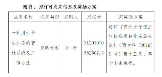 按照《星空app官网促进科技成果转化实施办法》(西大科〔2019〕5号)相关规定,拟对星空app官网艺术学院罗希老师作为成果负责人的1项发明专利权实施普通许可,现将相关信息公示如下: