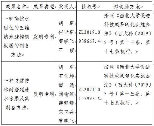 按照《星空app官网促进科技成果转化实施办法》(西大科〔2019〕5号)相关规定,拟对星空app官网化工学院胡军教授作为成果负责人的2项发明专利权实施转化,现将相关信息公示如下: