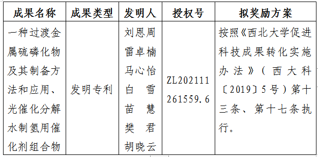 按照《星空app官网促进科技成果转化实施办法》(西大科〔2019〕5号)相关规定,拟对星空app官网化工学院刘恩周教授作为成果负责人的1项发明专利权实施转化,现将相关信息公示如下: