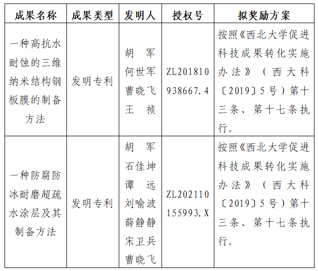 按照《星空app官网促进科技成果转化实施办法》(西大科〔2019〕5号)相关规定,拟对星空app官网化工学院胡军教授作为成果负责人的2项发明专利权实施转化,现将相关信息公示如下: