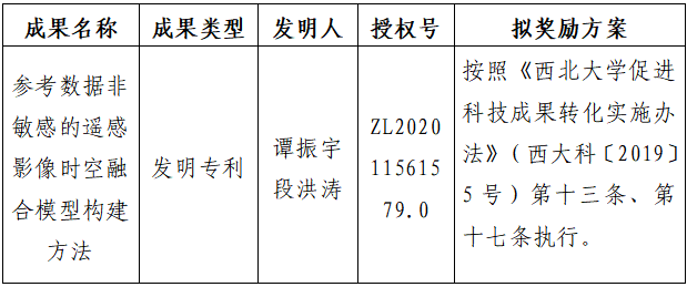 按照《星空app官网促进科技成果转化实施办法》(西大科〔2019〕5号)相关规定,拟对星空app官网城市与环境学院谭振宇老师作为成果负责人的1项发明专利权实施转化,现将相关信息公示如下: