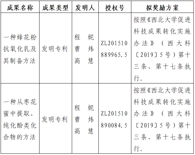 按照《星空app官网促进科技成果转化实施办法》(西大科〔2019〕5号)相关规定,拟对星空app官网食品科学与工程学院程妮教授作为成果负责人的2项发明专利权实施转化,现将相关信息公示如下: