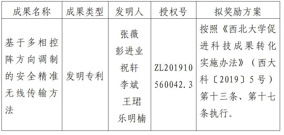 按照《星空app官网促进科技成果转化实施办法》(西大科〔2019〕5号)相关规定,拟对星空app官网信息科学与技术学院张薇老师作为成果负责人的1项发明专利权实施转化,现将相关信息公示如下: