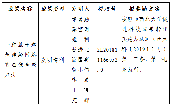 按照《星空app官网促进科技成果转化实施办法》(西大科〔2019〕5号)相关规定,拟对星空app官网信息科学与技术学院章勇勤教授作为成果负责人的1项发明专利权实施转化,现将相关信息公示如下: