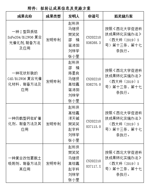 按照《星空app官网促进科技成果转化实施办法》(西大科〔2019〕5号)相关规定,拟对星空app官网化工学院赵彬侠教授作为成果负责人的4项专利申请权实施转化,现将相关信息公示如下: