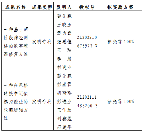 按照《星空app官网促进科技成果转化实施办法》(西大科〔2019〕5号)相关规定,拟对星空app官网艺术学院彭先霖老师作为成果负责人的2项发明专利权实施转化,现将相关信息公示如下: