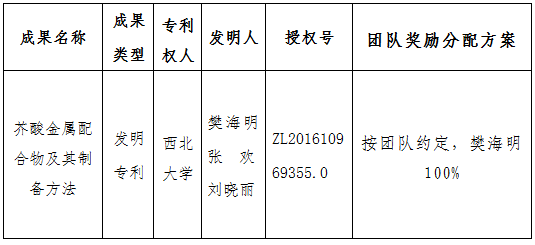 按照《星空app官网促进科技成果转化实施办法》(西大科〔2019〕5号)相关规定,经科技成果转化工作小组审议,校长办公会审定通过,拟对星空app官网化学与材料科学学院樊海明教授作为成果负责人的1项发明专利权实施以作价入股结合现金支付方式转让,现将相关信息公示如下:
