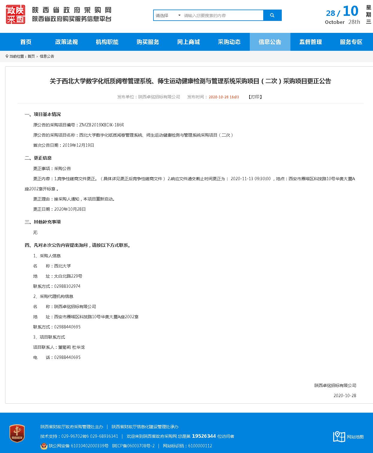 关于星空app官网数字化纸质阅卷管理系统、师生运动健康检测与管理系统采购项目(二次)采购项目更正公告