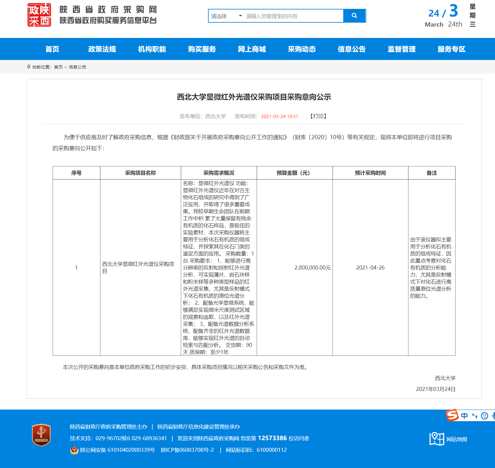 星空app官网显微红外光谱仪采购项目采购意向公示