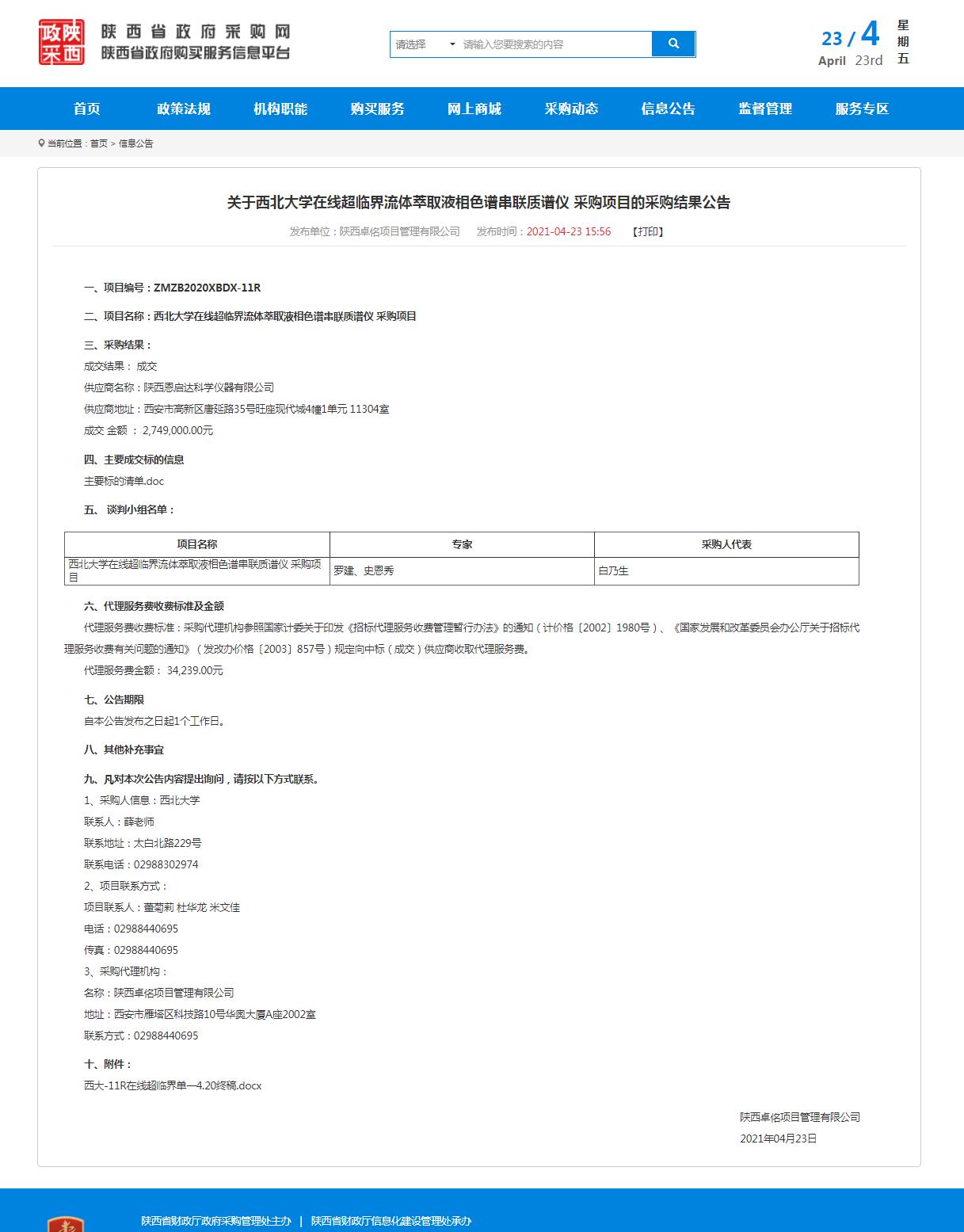 星空app官网在线超临界流体萃取液相色谱串联质谱仪 采购项目的采购结果公告