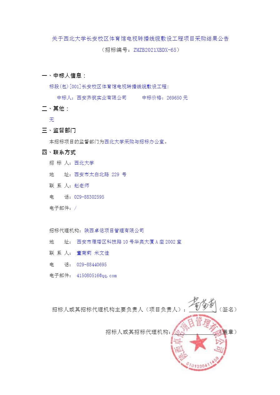 关于星空app官网长安校区体育馆电视转播线缆敷设工程项目采购结果公告