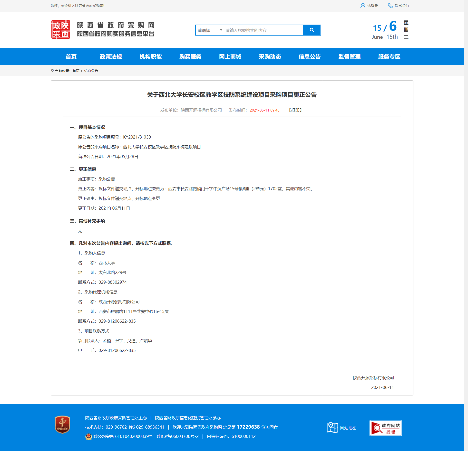 关于星空app官网长安校区教学区技防系统建设项目采购项目更正公告 作者: 编辑:薛利娟 时间:2021-06-15 原公告地址:http://www.ccgp-shaanxi.gov.cn/notice/noticeDetail.do?noticeguid=8a85be33791baa0f0179f8ab30151d42