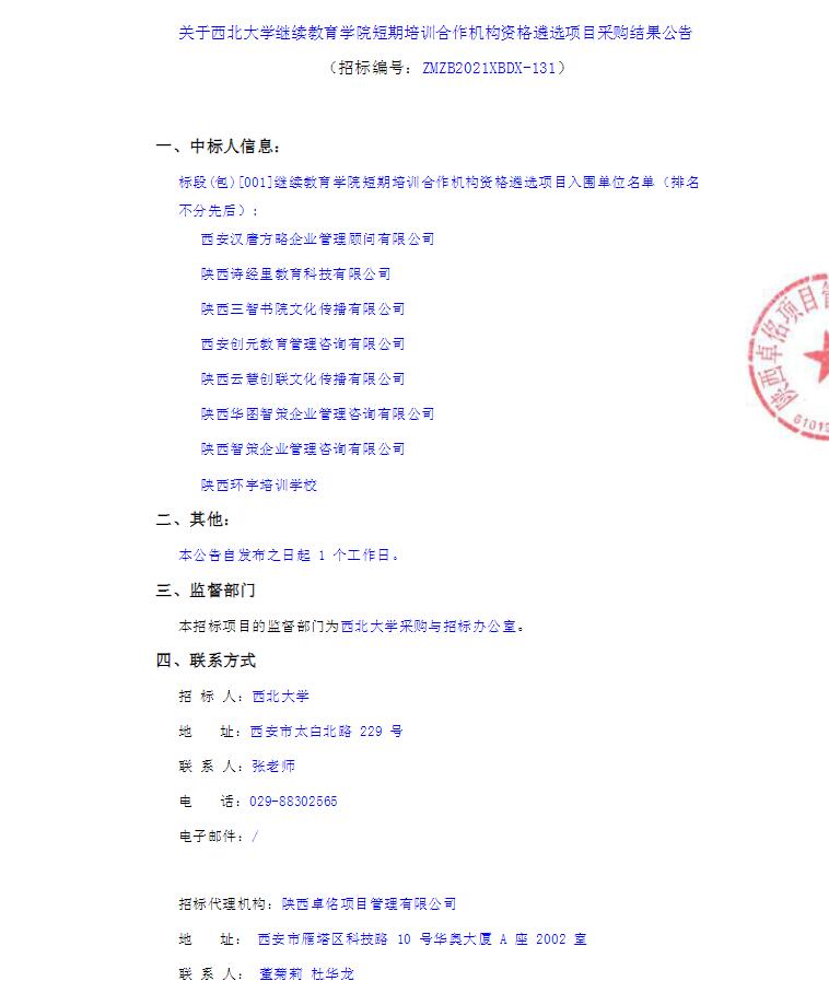 关于星空app官网继续教育学院短期培训合作机构资格遴选项目采购结果公告