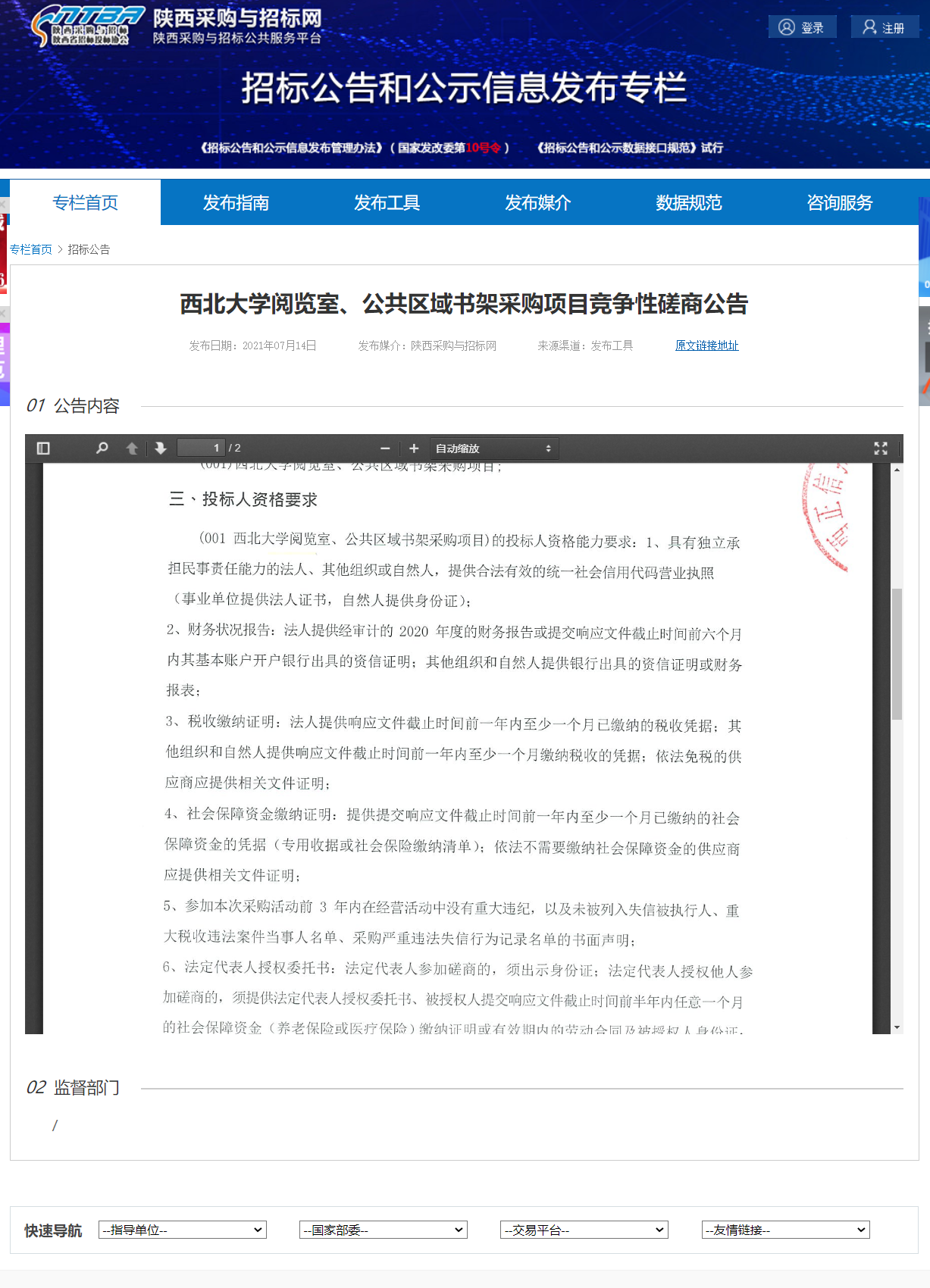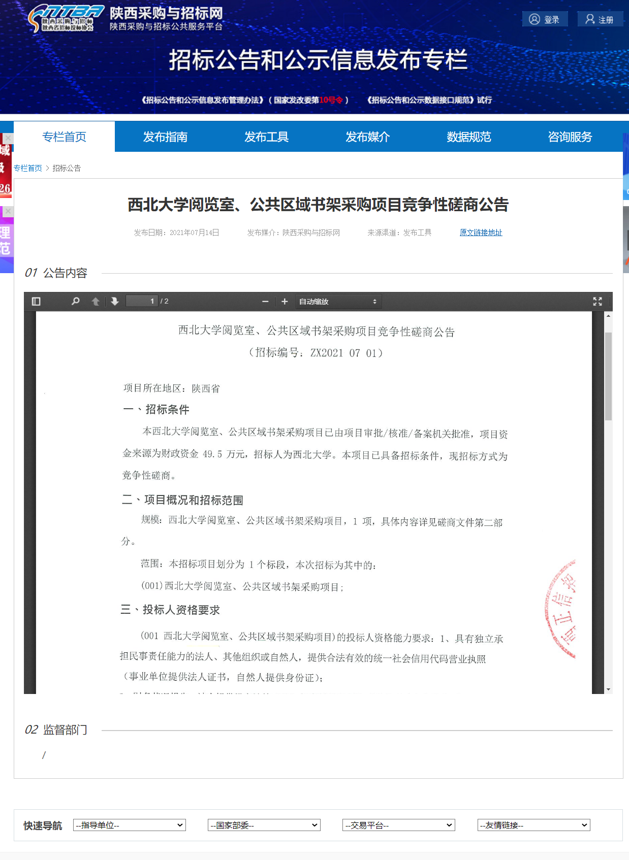 星空app官网阅览室、公共区域书架采购项目竞争性磋商公告 作者: 编辑:采购与招标办公室 时间:2021-07-15 原公告地址:http://bulletin.sntba.com/biddingBulletin/2021-07-14/318895.html