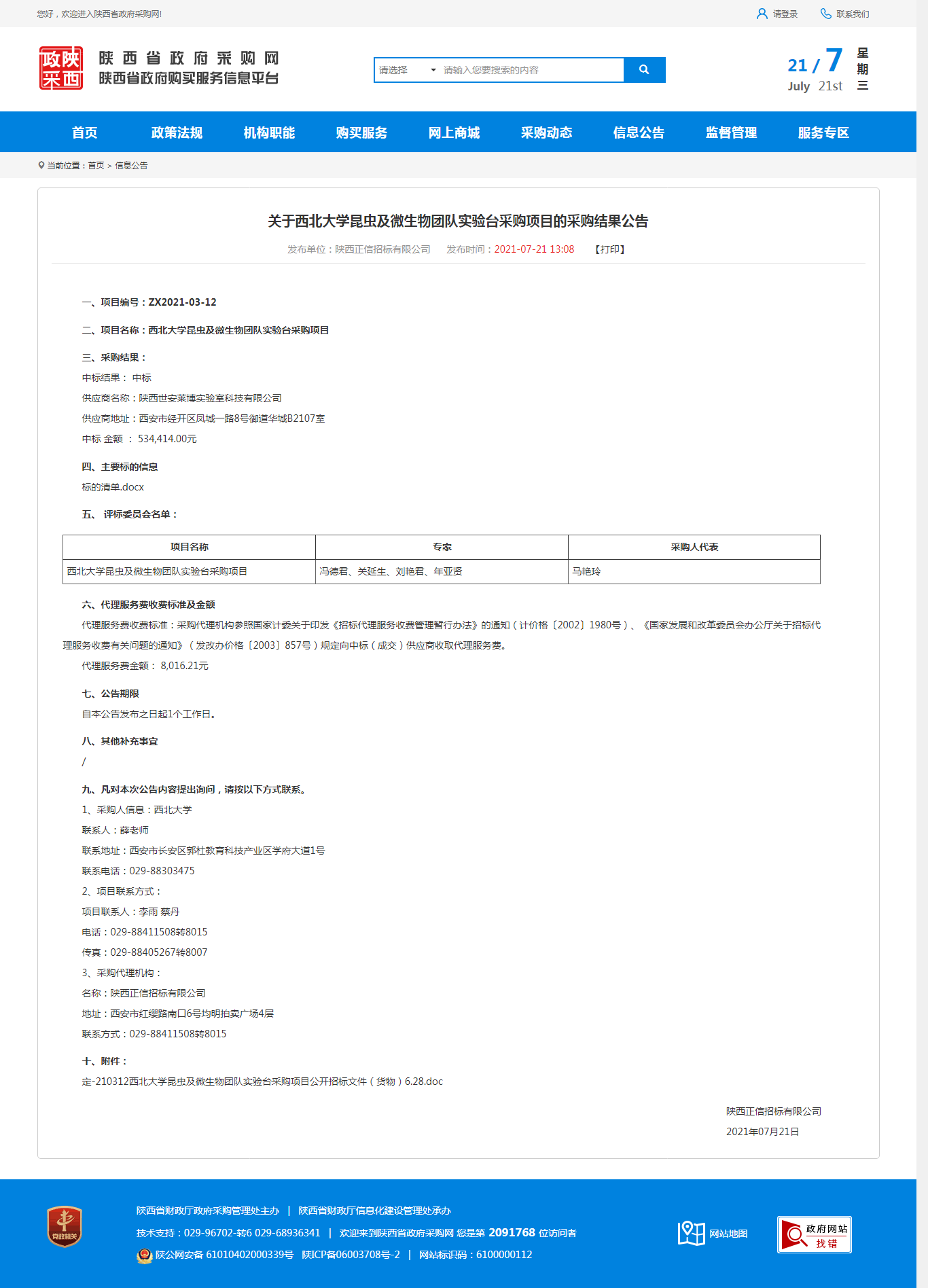 关于星空app官网昆虫及微生物团队实验台采购项目的采购结果公告 作者: 编辑:采购与招标办公室 时间:2021-07-21 原公告地址:http://www.ccgp-shaanxi.gov.cn/notice/noticeDetail.do?noticeguid=8a85be347a795e58017ac68e08ff1739