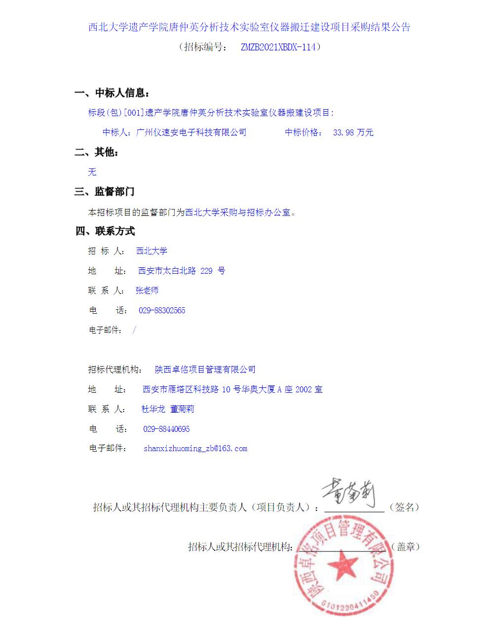 关于星空app官网遗产学院唐仲英分析技术实验室仪器搬迁建设项目采购结果公告