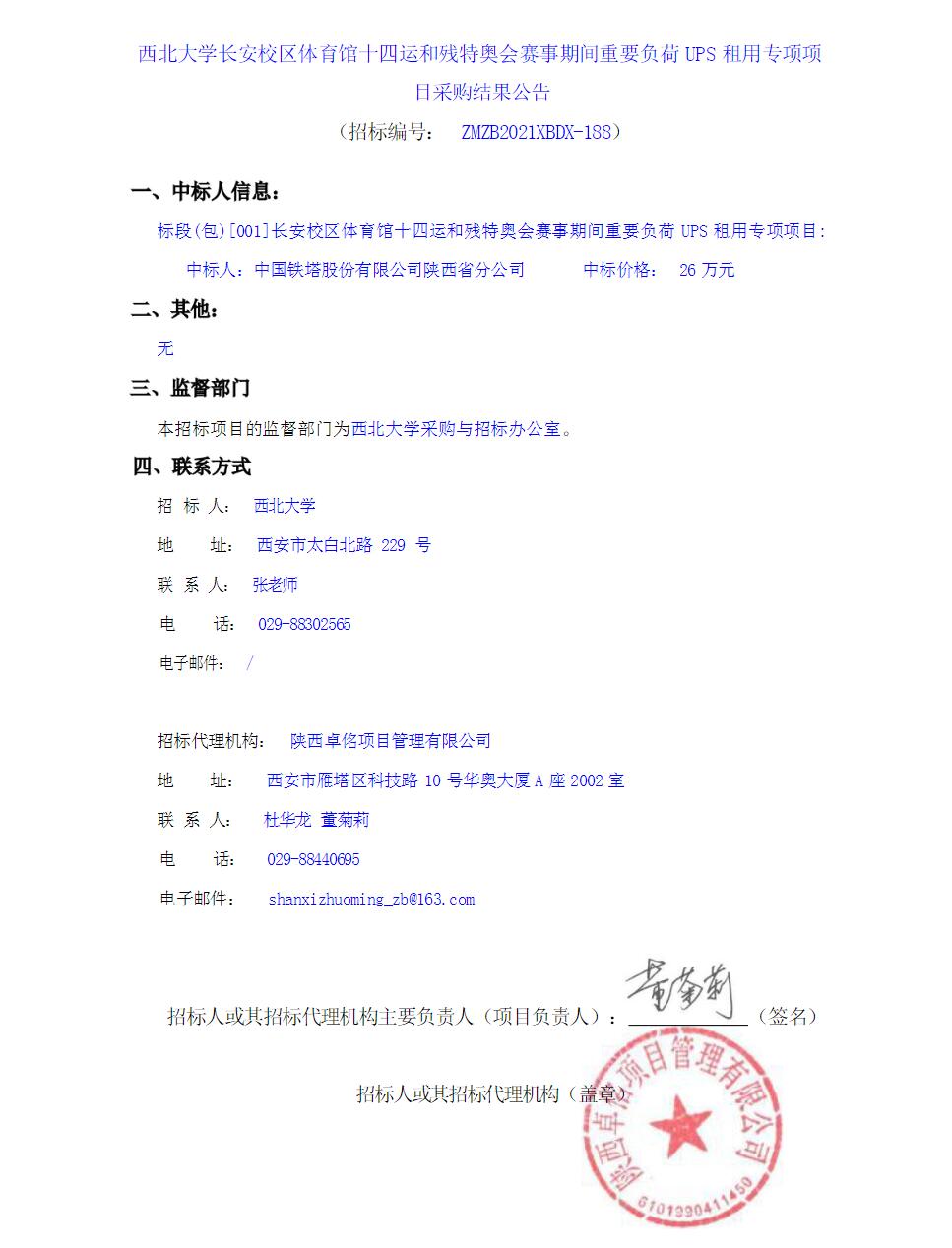 关于星空app官网长安校区体育馆十四运和残特奥会赛事期间重要负荷UPS租用专项项目采购结果公告