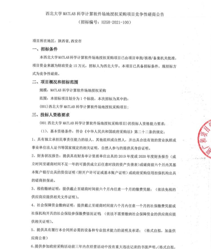 关于星空app官网MATLAB科学计算软件场地授权采购项目竞争性磋商公告
