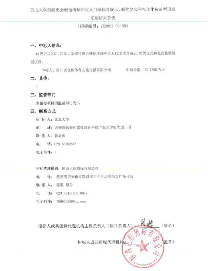 关于星空app官网残特奥会硬地滚球和盲人门球体育展示、颁奖仪式和礼仪化妆造型项目采购结果公告
