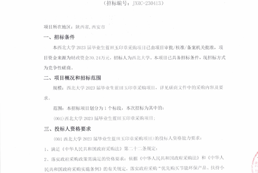 星空app官网2023届毕业生蓝田玉印章采购项目竞争性磋商公告 作者: 编辑:采购与招标办公室 时间:2023-04-21 原公告链接:http://bulletin.sntba.com/biddingBulletin/2023-04-21/550306.html