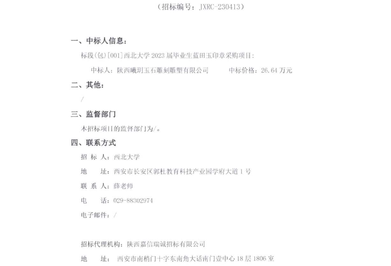 星空app官网2023届毕业生蓝田玉印章采购项目成交结果公告 作者: 编辑:采购与招标办公室 时间:2023-05-05 原公告链接:http://bulletin.sntba.com/resultBulletin/2023-05-05/554805.html