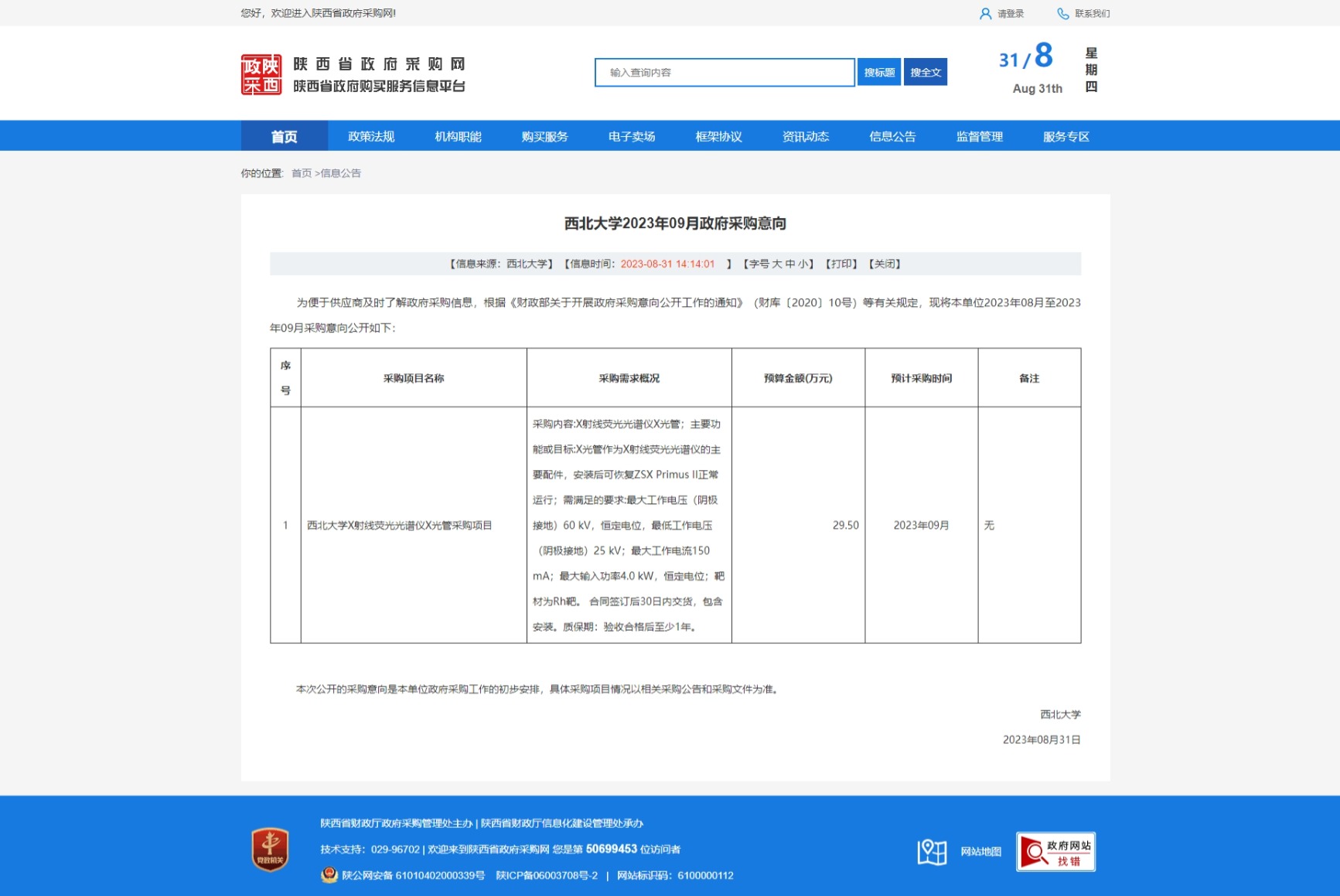 星空app官网2023年09月政府采购意向 作者: 编辑: 时间:2023-08-31 原公告链接:http://www.ccgp-shaanxi.gov.cn/freecms/site/shaanxi/ggxx/info/2023/8a69c1f48a442b3e018a445d305713ea.html?noticeType=59¬iceId=c7afb278-47c6-11ee-9a8e-08c0eb20c666