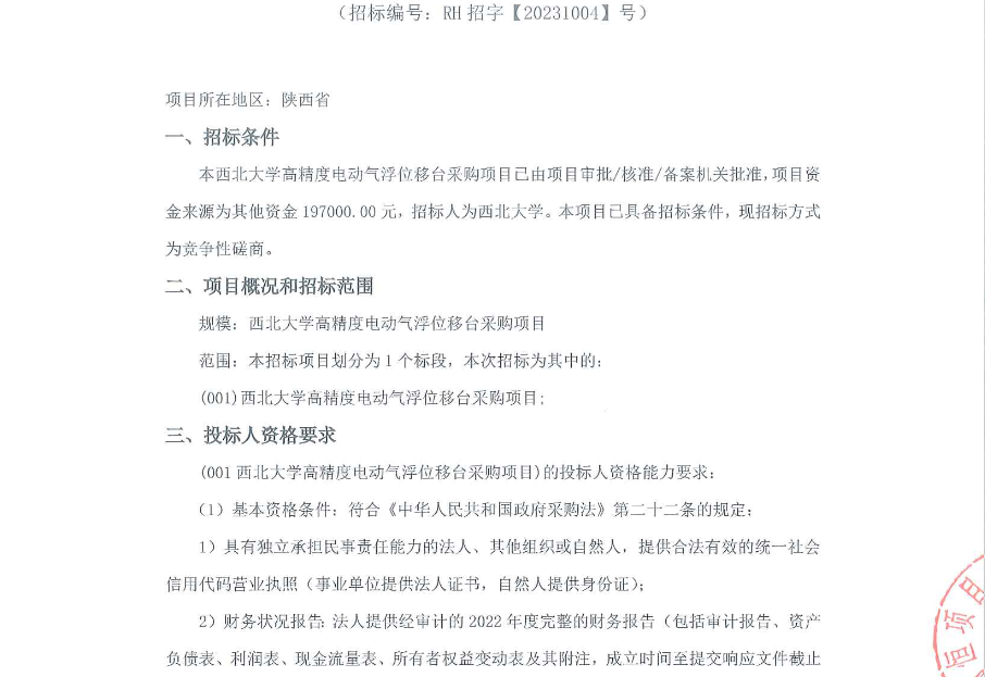 星空app官网高精度电动气浮位移台采购项目竞争性磋商公告 作者: 编辑:采购与招标办公室 时间:2023-10-18 原公告链接:http://bulletin.sntba.com/biddingBulletin/2023-10-17/735313.html