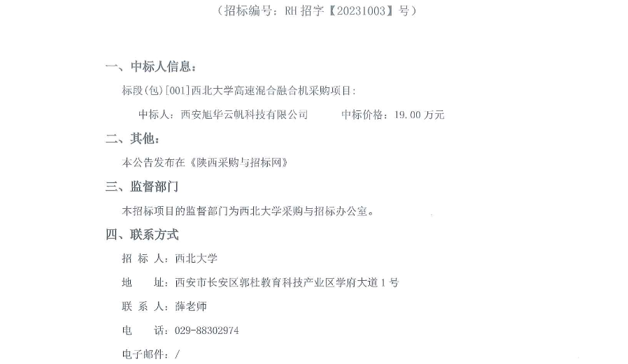 星空app官网高速混合融合机采购项目成交结果公告 作者: 编辑:采购与招标办公室 时间:2023-10-31 原公告链接:http://bulletin.sntba.com/resultBulletin/2023-10-31/770873.html