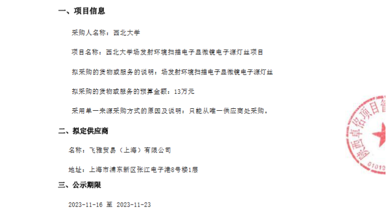 星空app官网场发射环境扫描电子显微镜电子源灯丝项目单一来源采购征求意见公示 作者: 编辑:采购与招标办公室 时间:2023-11-16 原公告链接:http://www.sntba.com/website/gg_show.aspx?id=260702