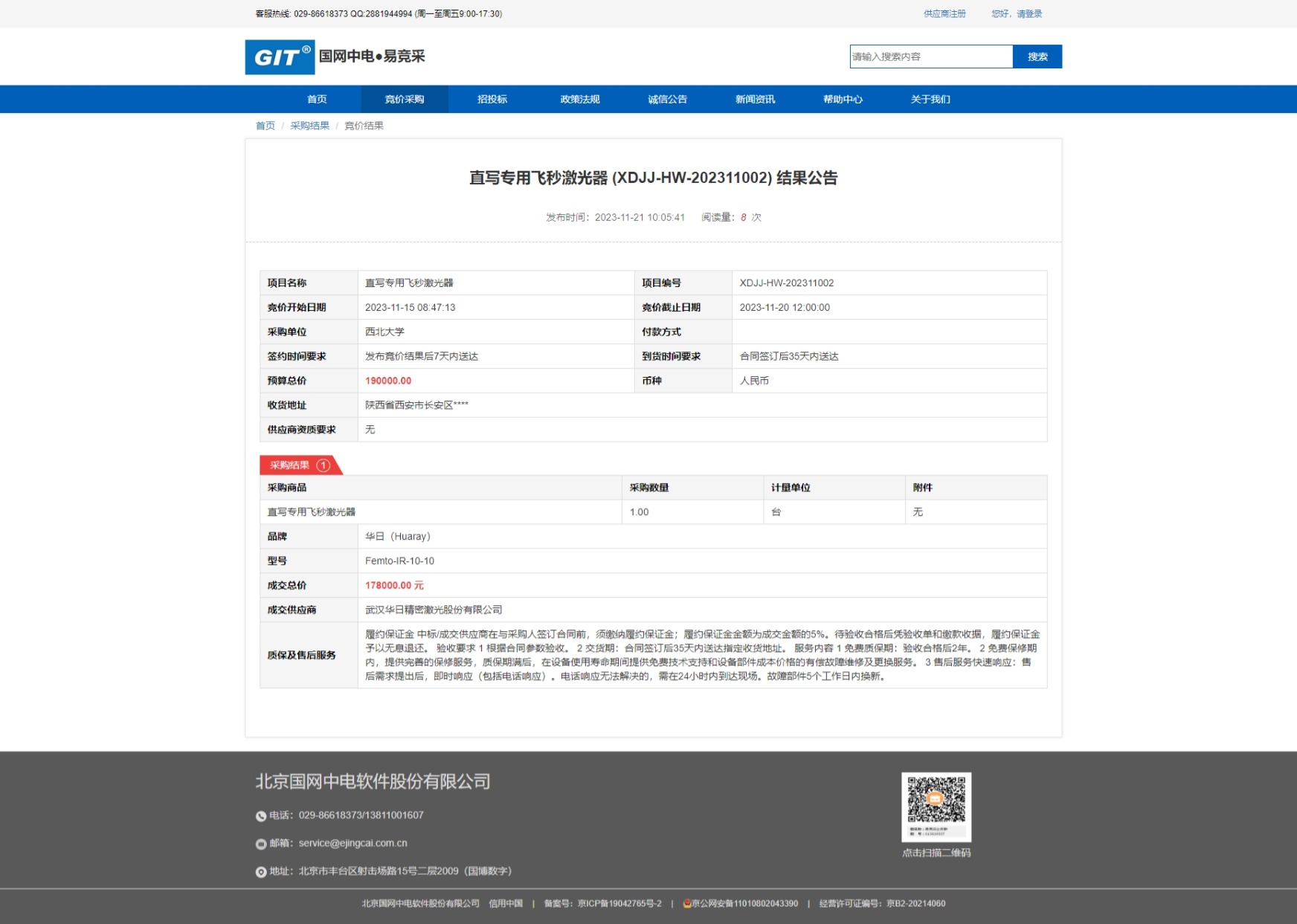 星空app官网直写专用飞秒激光器采购项目结果公告 作者: 编辑:采购与招标办公室 时间:2023-11-22 原公告链接:https://www.ejingcai.com.cn/site/bidding/detail/6959