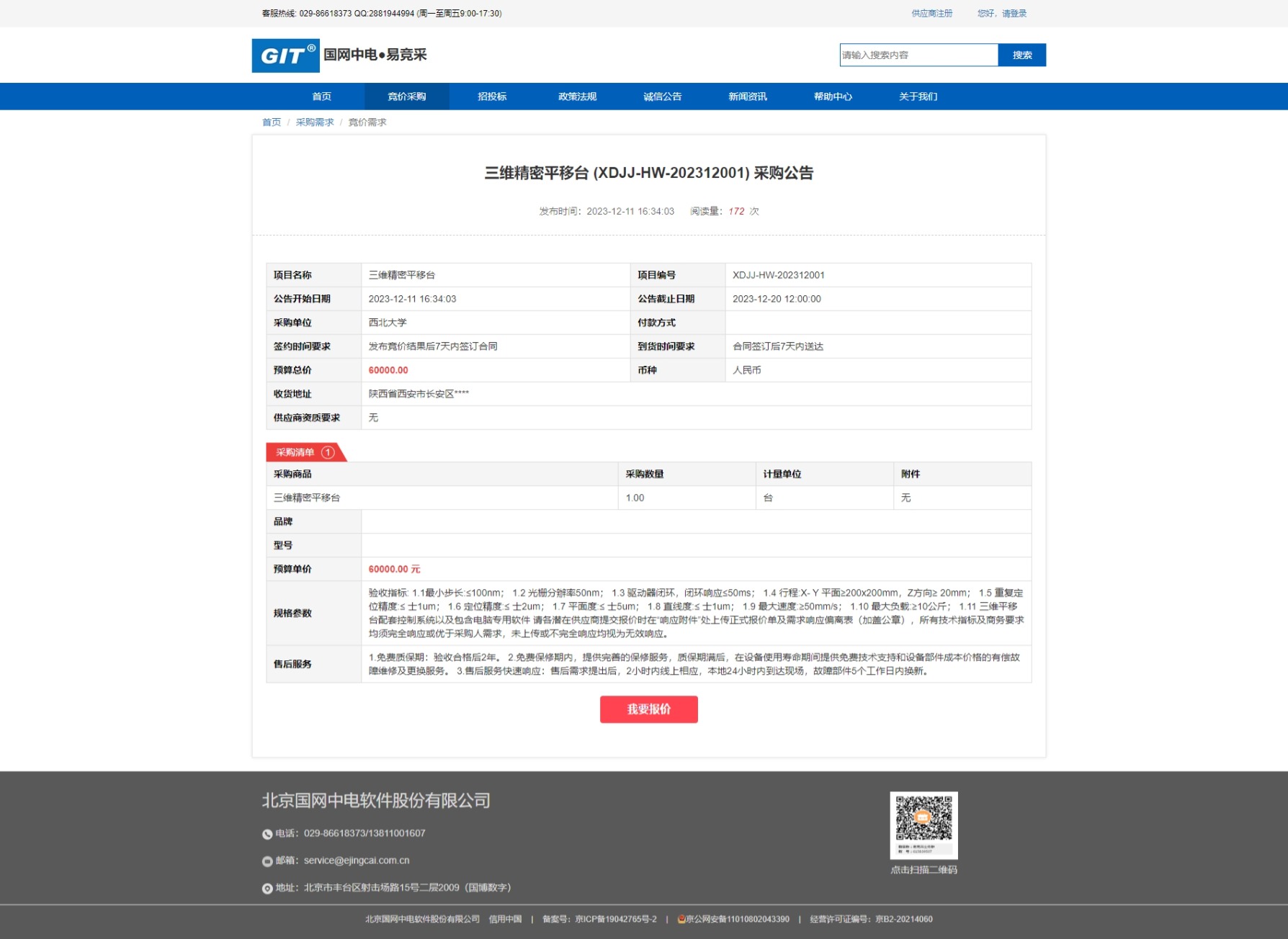 星空app官网三维精密平移台 (XDJJ-HW-202312001) 采购公告 作者: 编辑:王雯岚 时间:2023-12-19 原公告链接:https://www.ejingcai.com.cn/site/bidding/detail/7727