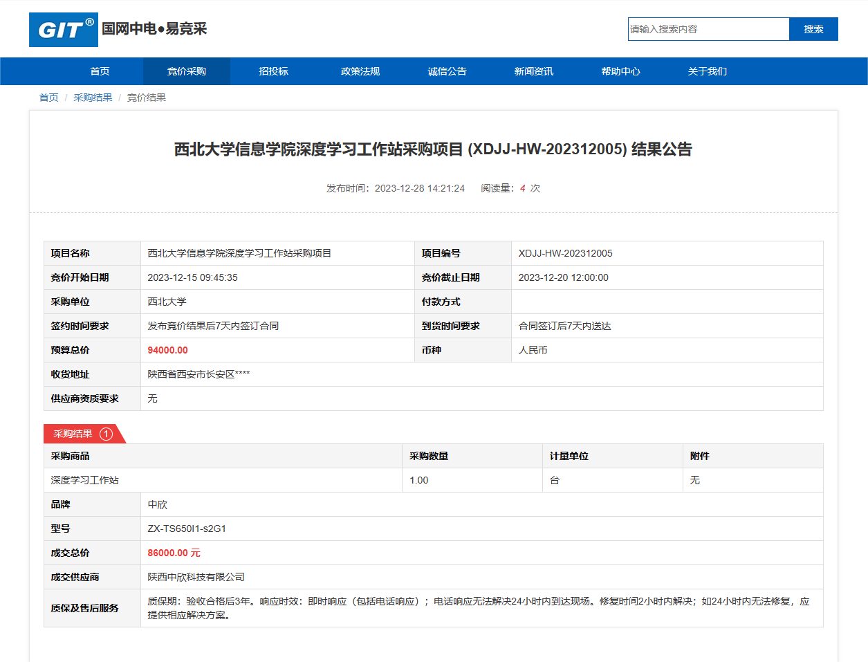 星空app官网信息学院深度学习工作站采购项目 (XDJJ-HW-202312005) 竞价结果公告 作者: 编辑:采购与招标办公室 时间:2023-12-28 原公告链接:https://www.ejingcai.com.cn/site/bidding/detail/8075
