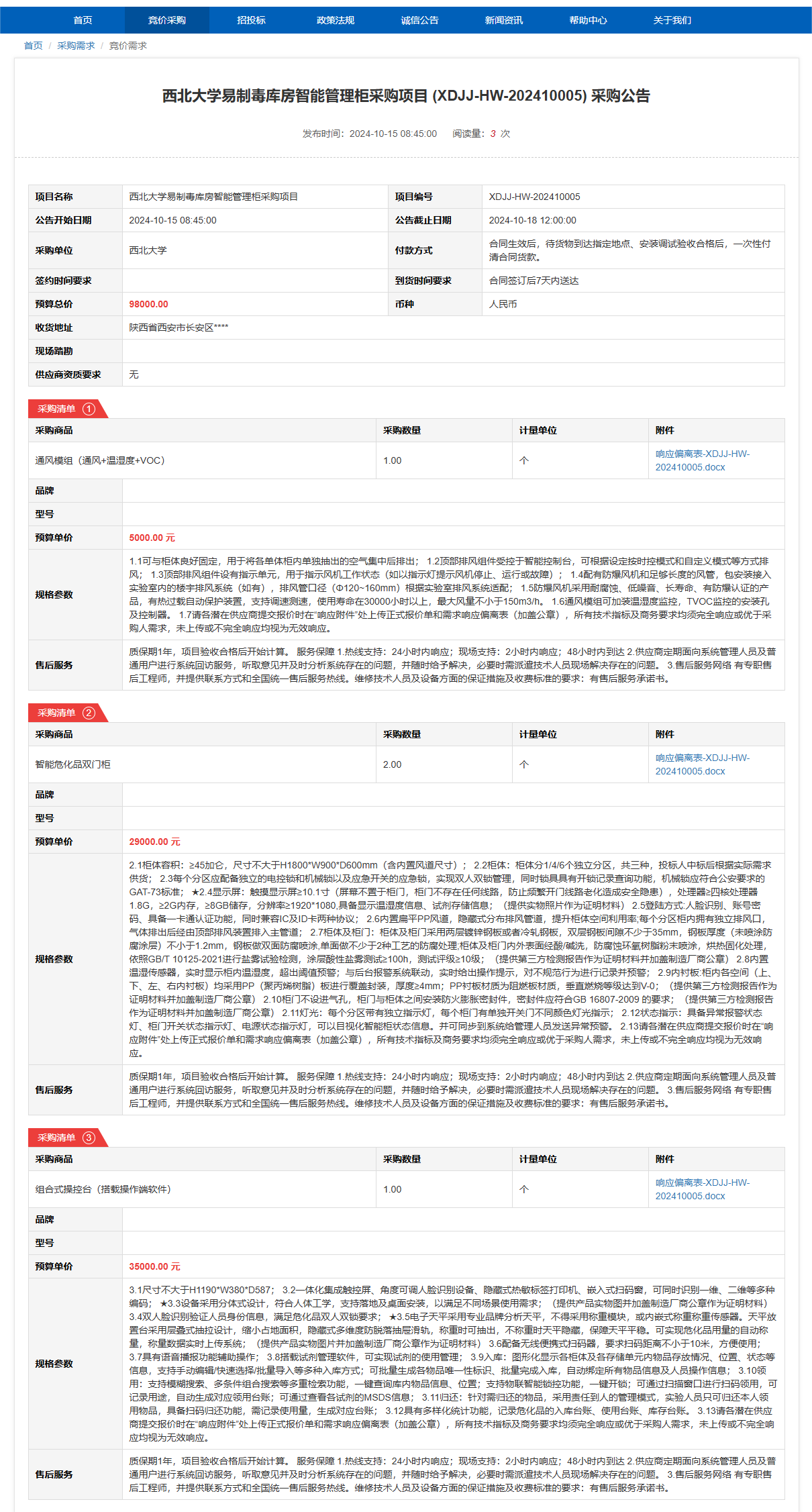 星空app官网易制毒库房智能管理柜采购项目(XDJJ-HW-202410005)竞价采购公告 作者:采购与招标办公室 编辑: 时间:2024-10-15 原公告链接:https://www.ejingcai.com.cn/site/bidding/detail/13297
