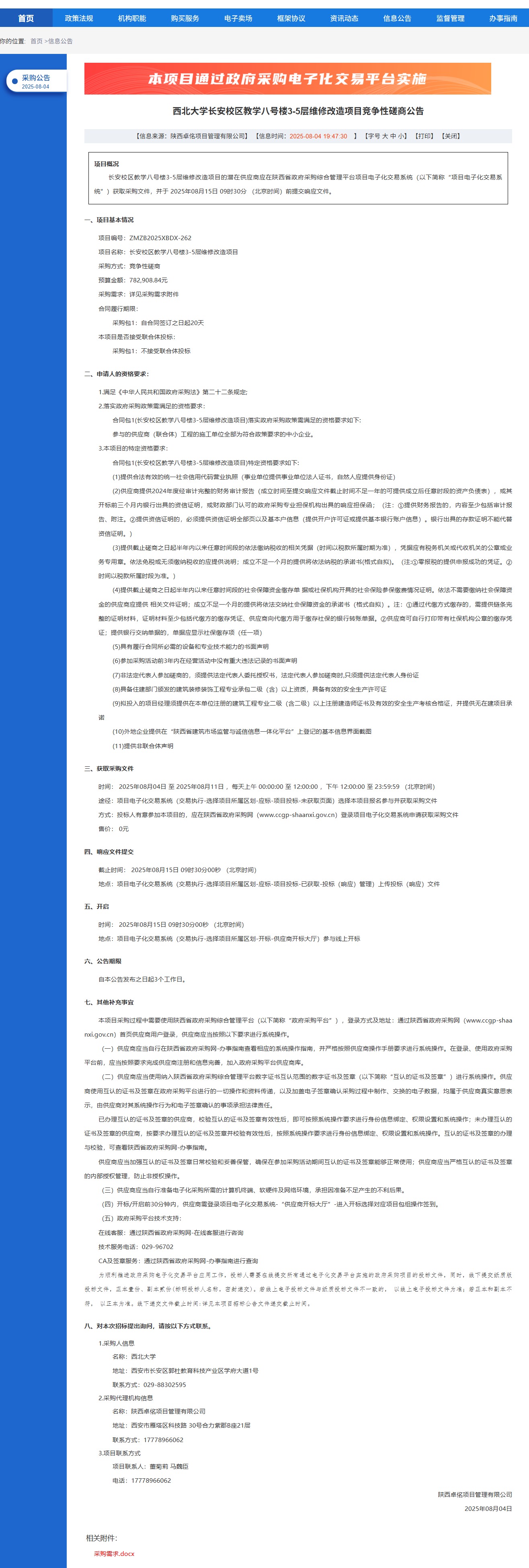 星空app官网长安校区教学八号楼3-5层维修改造项目竞争性磋商公告 作者: 编辑:党丹珩 时间:2025-08-04 公告地址:https://www.ccgp-shaanxi.gov.cn/freecms/site/shaanxi/ggxx/info/2025/8a69c7f19860ef06019874dfc954016d.html?noticeType=001016¬iceId=d92bc43a-712a-11f0-8063-08c0eb20c666