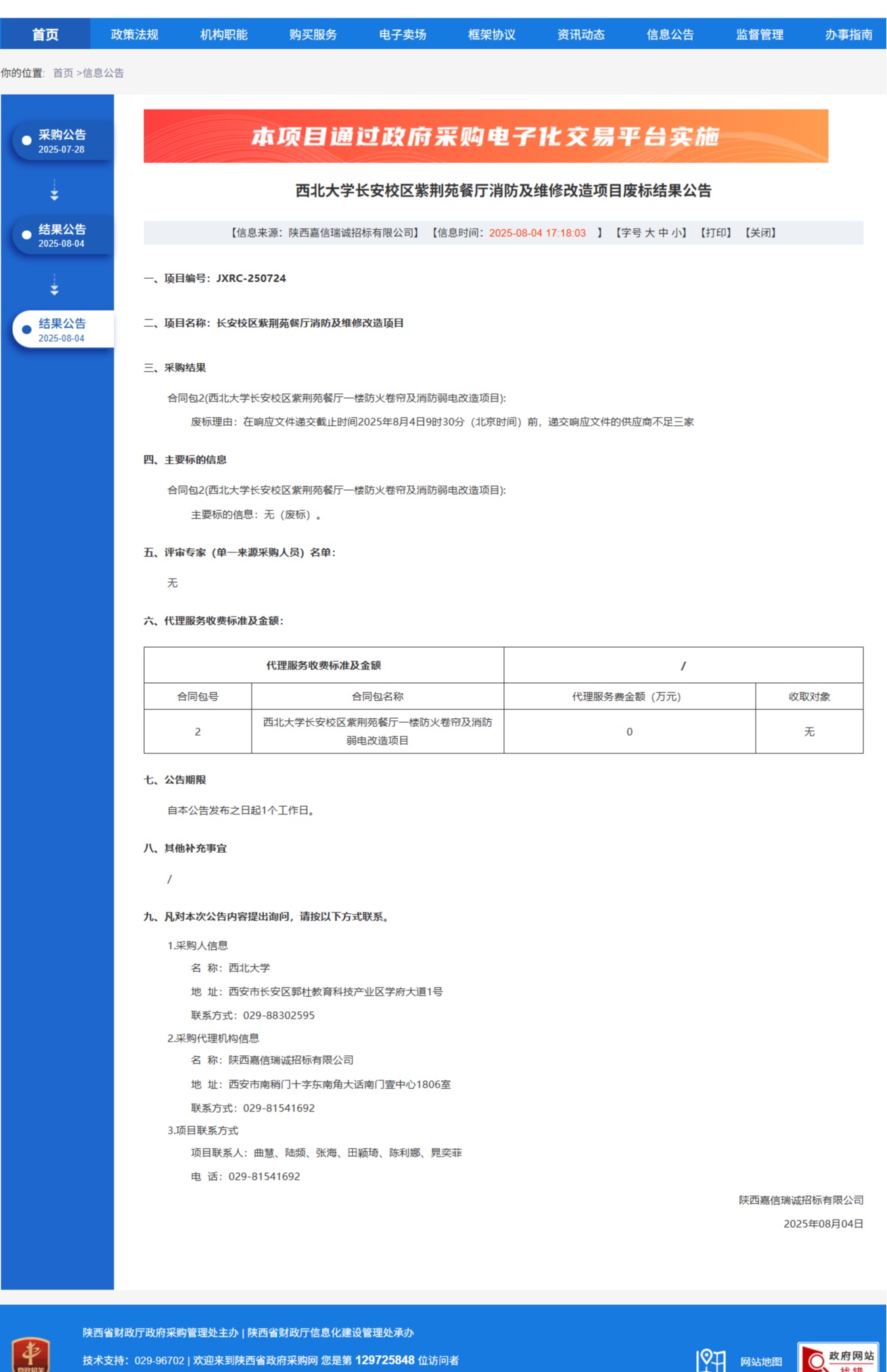 星空app官网长安校区紫荆苑餐厅消防及维修改造项目废标结果公告 作者: 编辑:党丹珩 时间:2025-08-04 公告地址:http://www.ccgp-shaanxi.gov.cn/freecms/site/shaanxi/ggxx/info/2025/8a69c0c89860f6020198742efac05b51.html?noticeType=001006¬iceId=f838eaa2-7115-11f0-8063-08c0eb20c666
