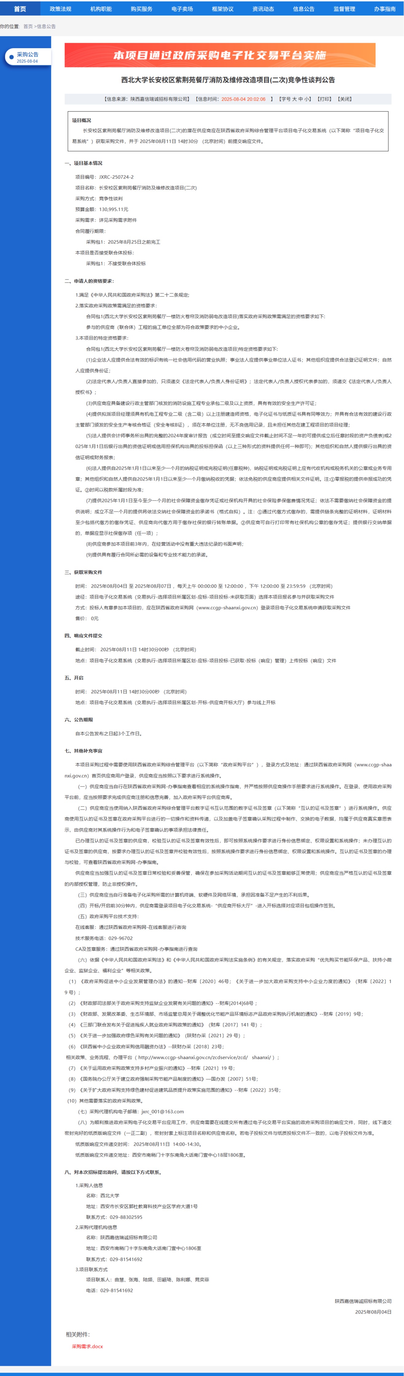 星空app官网长安校区紫荆苑餐厅消防及维修改造项目(二次)竞争性谈判公告 作者: 编辑:党丹珩 时间:2025-08-04 公告地址:https://www.ccgp-shaanxi.gov.cn/freecms/site/shaanxi/ggxx/info/2025/8a69c1e29860ef6f019874c6b4a22713.html?noticeType=001013¬iceId=e37c65dc-712c-11f0-8063-08c0eb20c666