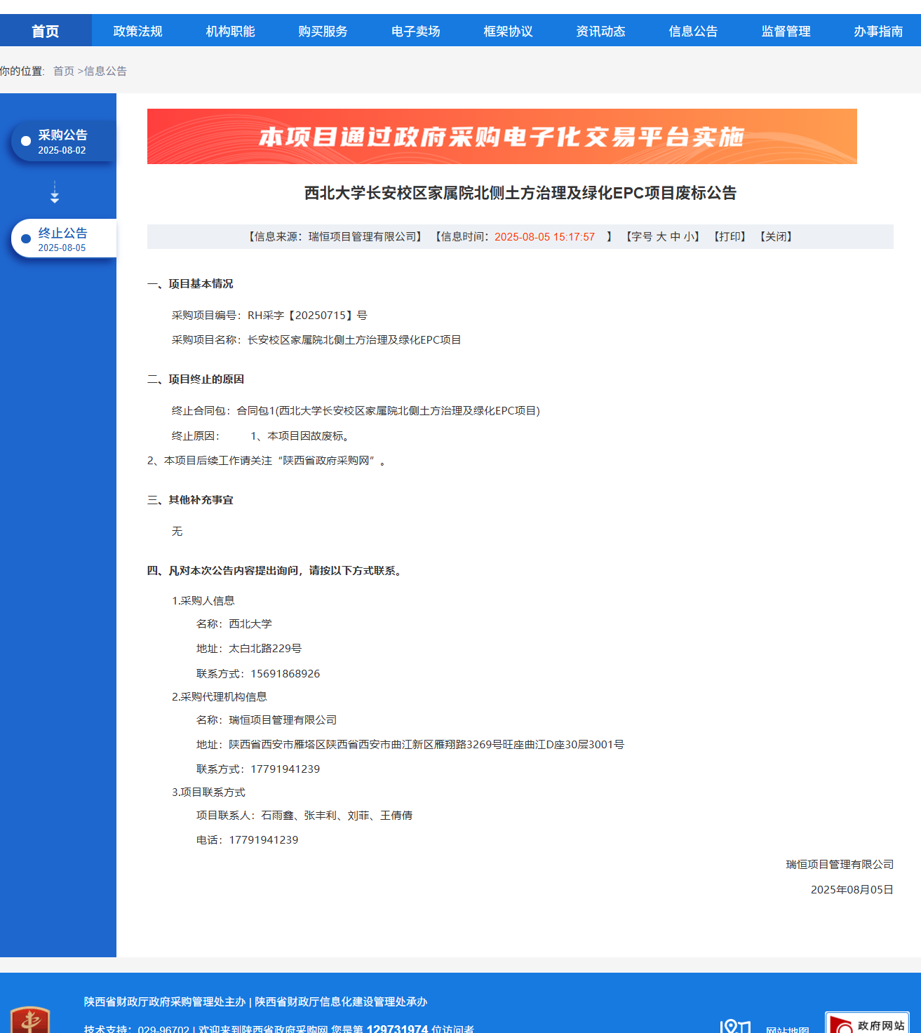 星空app官网长安校区家属院北侧土方治理及绿化EPC项目废标公告 作者: 编辑:党丹珩 时间:2025-08-05 公告地址:http://www.ccgp-shaanxi.gov.cn/freecms/site/shaanxi/ggxx/info/2025/8a69c8f99860f21c0198790d379441f5.html?noticeType=001004¬iceId=5c6803f0-71ce-11f0-8063-08c0eb20c666