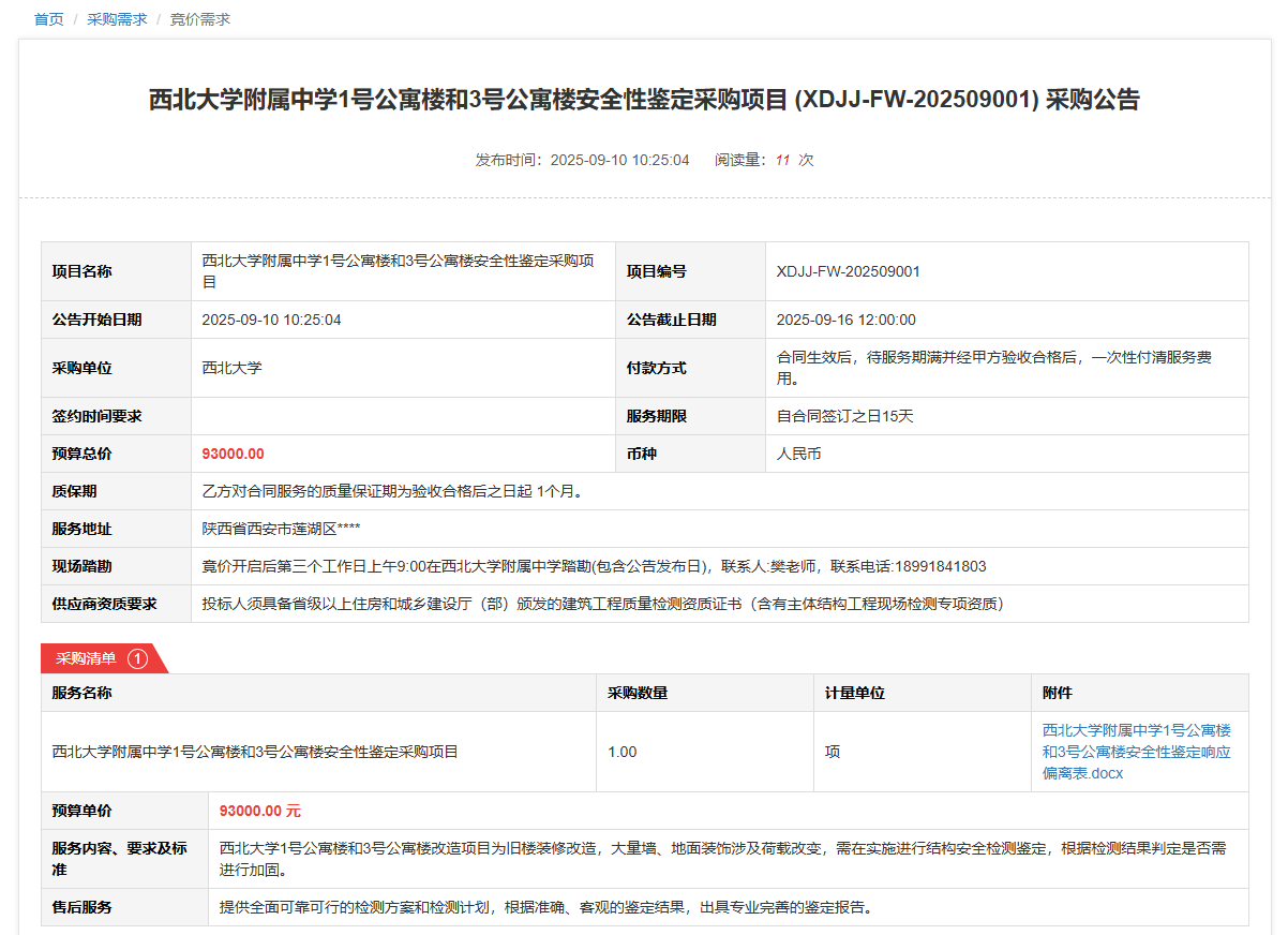 星空app官网附属中学1号公寓楼和3号公寓楼安全性鉴定采购项目(XDJJ-FW-202509001)竞价采购公告