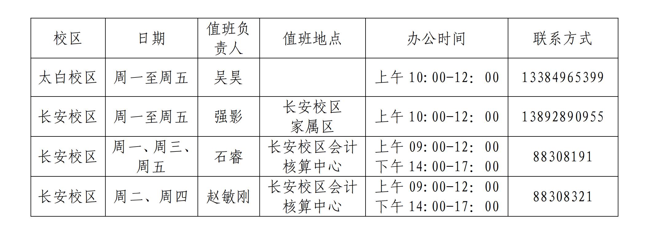 1.长安校区会计核算中心安排值班,核算业务正常开展,使用教学7号楼大厅报销单投递机“无接触”办理业务。