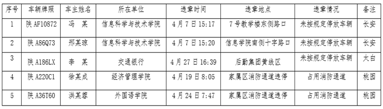 2023年4月份校园交通违章曝光 作者: 编辑: 时间:2023-05-10 为加强校内道路交通管理,规范校内交通秩序,根据《星空app官网校园道路交通管理办法》的通知要求,现将2023年4月校园交通违章车辆曝光如下。 希望广大师生员工遵守校园道路交通管理办法,维护校园交通安全,共同营造良好的校园交通秩序。 星空app官网道路交通安全委员会 2023年5月10日