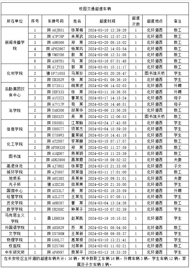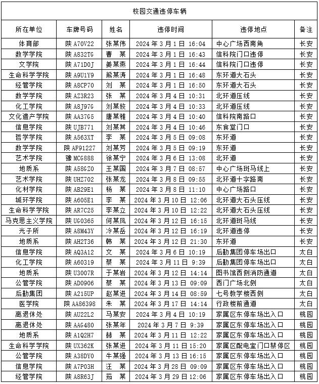 为加强校内道路交通安全管理,规范校内交通秩序,根据《星空app官网校园道路交通管理办法》有关要求,现将2024年3月校园交通违章车辆予以曝光,所在单位负责对本单位违章师生员工进行交通安全教育和日常管理。